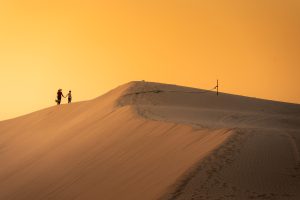 Aerial view of a peasant woman carries a bamboo frame on the shoulder across sand dunes in Ninh Thuan province, Vietnam. It is one of the most beautiful places in Vietnam for travel and photography