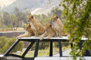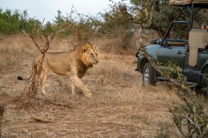 safari jeep near male lion in kruger park south africa close up