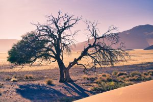 Horizontal shot of a dying tree in the desert of Sossusvlei, Namibia with dramatic light during golden hour. Beauty in nature