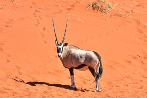 Oryx along the desert landscape in the NamibRand Nature Reserve in Namibia.