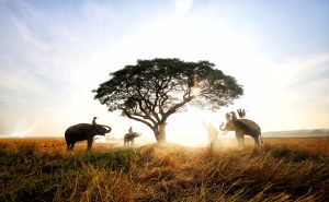 Thailand Countryside; Silhouette elephant on the background of sunset, elephant Thai in Surin Thailand.