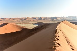 Sossusvlei (sometimes written Sossus Vlei) is a salt and clay pan surrounded by high red dunes, located in the southern part of the Namib Desert, in the Namib-Naukluft National Park of Namibia.